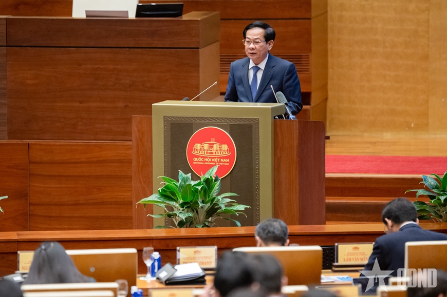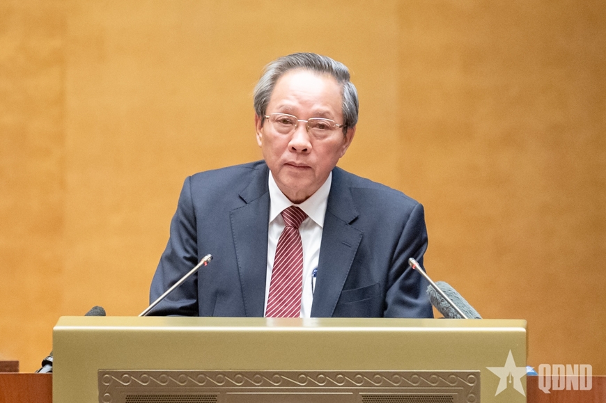 Ủy viên Bộ Chính trị, Phó thủ tướng Thường trực Chính phủ, Phó chủ tịch Hội đồng Bầu cử quốc gia Nguyễn Hòa Bình báo cáo tại hội nghị. Ảnh: PHẠM THẮNG