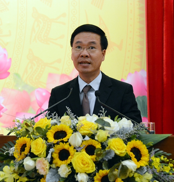 | Trưởng ban Tuyên giáo Trung ương Võ Văn Thưởng trình bày tổng luận hội thảo. |