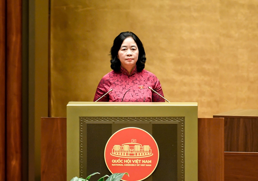 Đồng chí Bùi Thị Minh Hoài, Ủy viên Bộ Chính trị, Bí thư Trung ương Đảng, Chủ tịch Ủy ban Trung ương Mặt trận Tổ quốc Việt Nam trình bày Báo cáo tổng hợp ý kiến, kiến nghị của cử tri và nhân dân gửi đến Kỳ họp thứ nhất, Quốc hội khóa XVI. Ảnh: TRỌNG HẢI