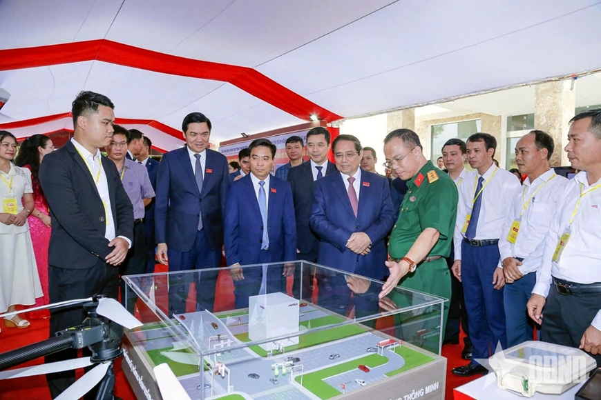 | Thủ tướng Chính phủ tham quan mô hình hệ thống điều khiển giao thông thông minh của Tập đoàn Công nghiệp - Viễn thông Quân đội (Viettel) trưng bày tại đại hội. |