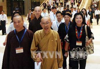 | Đại biểu các tỉnh, thành phố trong cả nước phấn khởi về dự Đại hội Đại biểu toàn quốc Mặt trận Tổ quốc Việt Nam lần thứ VII diễn ra tại Thủ đô Hà Nội từ 28 đến 30/9/2009. Ảnh : Nguyễn Dân -TTXVN |