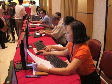 | Phóng viên tác nghiệp tại Trung tâm Báo chí. |