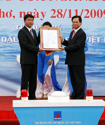 | Thủ tướng Nguyễn Tấn Dũng trao quyết định lấy ngày 27-11 hàng năm là Ngày Truyền thống ngành Dầu khí Việt Nam cho ông Đinh La Thăng, Chủ tịch HĐQT Tập đoàn Dầu khí Việt Nam. |