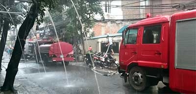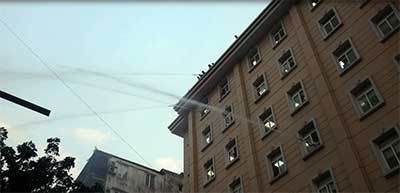 Phun nước dập đám cháy từ tòa nhà cao tầng.