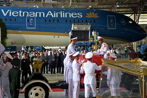Linh cữu nguyên Chủ tịch nước, Đại tướng Lê Đức Anh từ trên máy bay được đưa xuống linh xa.