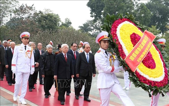 Lãnh đạo Đảng, Nhà nước đặt vòng hoa tưởng niệm các anh hùng liệt sĩ. Ảnh: TTXVN. |