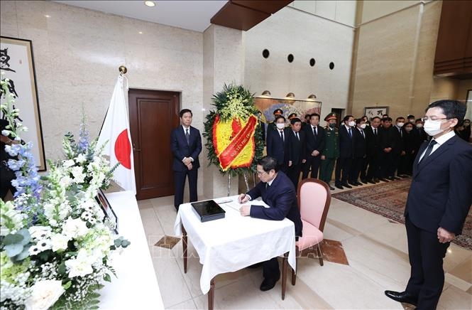 | Thủ tướng Chính phủ Phạm Minh Chính ghi sổ tang tưởng niệm cố Thủ tướng Nhật Bản Abe Shinzo. Ảnh: TTXVN |