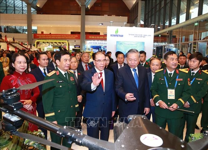 | Tổng Bí thư Tô Lâm và các đại biểu tham quan gian trưng bày sản phẩm của Bộ Quốc phòng bên lề đại hội. |