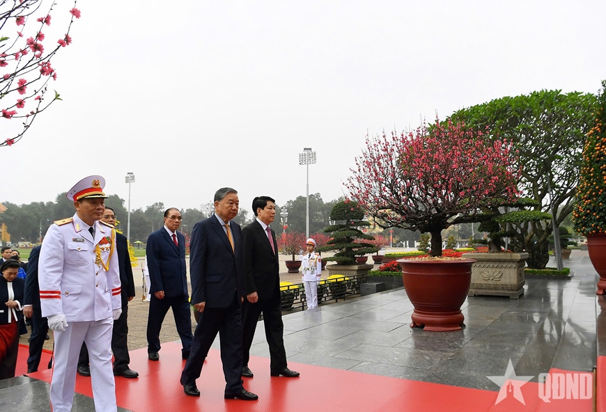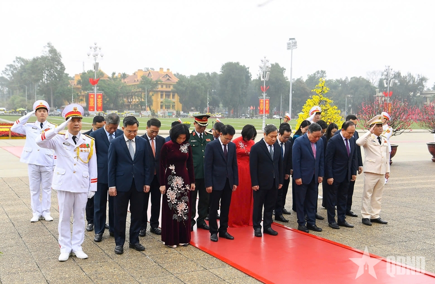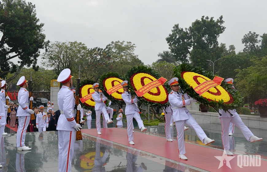 Đoàn đại biểu lãnh đạo, nguyên lãnh đạo Đảng, Nhà nước, Mặt trận Tổ quốc Việt Nam đặt vòng hoa, vào Lăng viếng Chủ tịch Hồ Chí Minh.