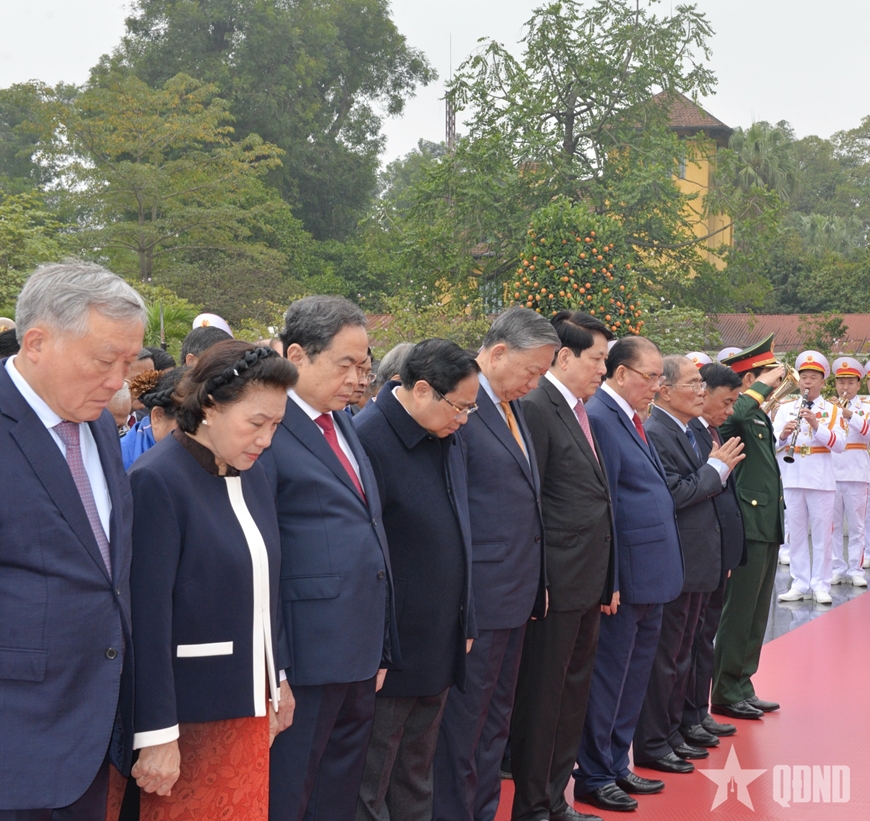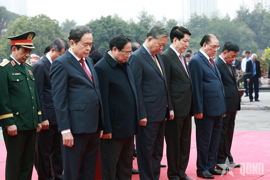 | Đoàn đại biểu lãnh đạo, nguyên lãnh đạo Đảng, Nhà nước, Mặt trận Tổ quốc Việt Nam đặt vòng hoa, tưởng niệm các Anh hùng liệt sĩ. |