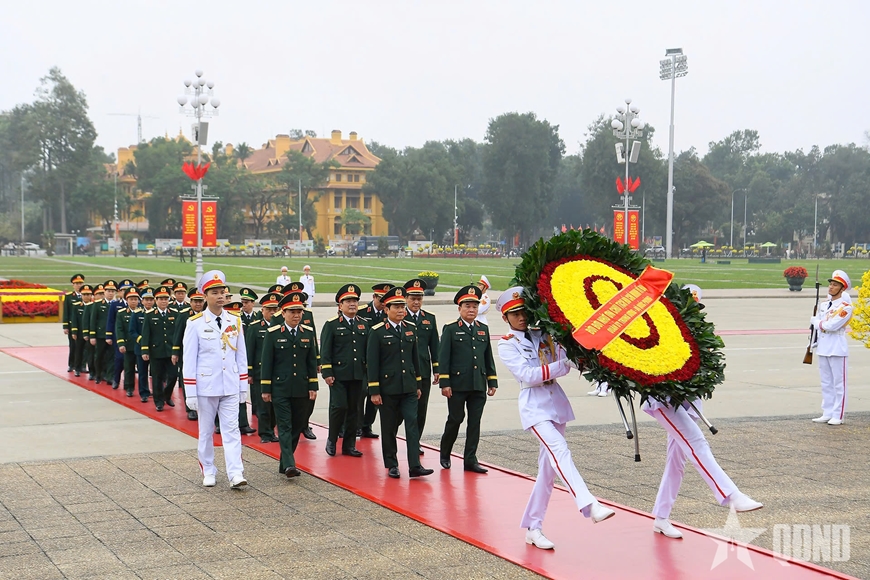| Đoàn đại biểu Quân ủy Trung ương, Bộ Quốc phòng đặt vòng hoa, vào Lăng viếng Chủ tịch Hồ Chí Minh. |
