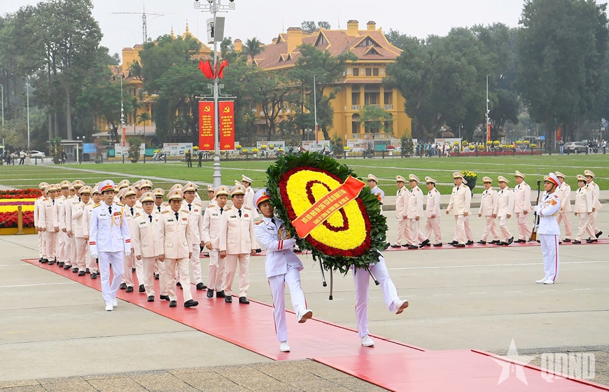 | Đoàn đại biểu Đảng ủy Công an Trung ương, Bộ Công an đặt vòng hoa, vào Lăng viếng Chủ tịch Hồ Chí Minh. |