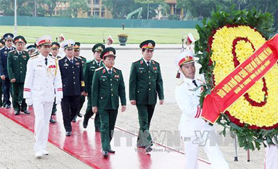 Đoàn đại biểu Quân ủy Trung ương và Bộ Quốc phòng đặt vòng hoa và vào Lăng viếng Chủ tịch Hồ Chí Minh. Ảnh: TTXVN