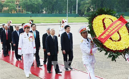 Các đồng chí lãnh đạo Đảng, Nhà nước vào Lăng viếng Chủ tịch Hồ Chí Minh. Ảnh: TTXVN