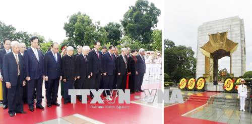 Tiếp đó, Đoàn đại biểu Ban Chấp hành Trung ương Đảng, Chủ tịch nước, Quốc hội, Chính phủ, Ủy ban Trung ương Mặt trận Tổ quốc Việt Nam đã đến đặt vòng hoa và tưởng niệm các Anh hùng Liệt sĩ tại Đài tưởng niệm các Anh hùng Liệt sĩ, đường Bắc Sơn, Hà Nội.