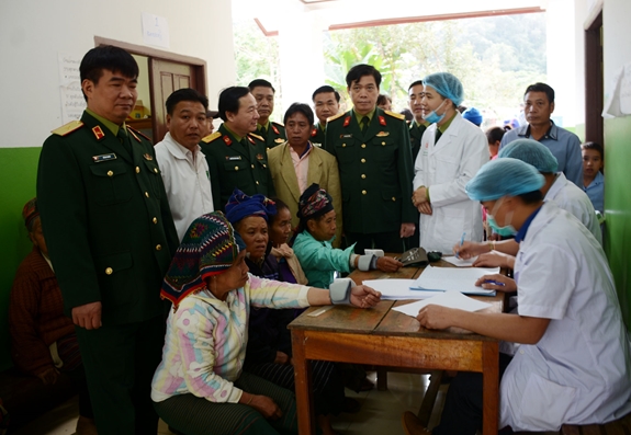 Lãnh đạo TCHC QĐND Việt Nam và chính quyền huyện Xiengkhor động viên đồng bào đến khám chữa bệnh. |