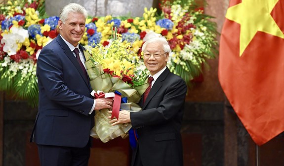 Thay mặt Nhà nước và nhân dân ta, Tổng Bí thư, Chủ tịch nước Nguyễn Phú Trọng nhiệt liệt chào mừng đồng chí Miguel Mario Diáz Canel Bermúdez thăm hữu nghị chính thức Việt Nam lần đầu tiên trên cương vị Chủ tịch HĐNN và HĐBT nước Cộng hòa Cuba.