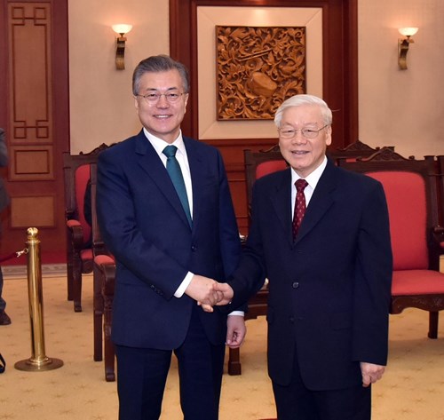 Tổng Bí thư Nguyễn Phú Trọng tiếp Tổng thống Hàn Quốc Moon Jae-in. |