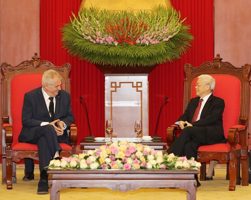 Tổng Bí thư hoan nghênh kết quả hội đàm giữa Tổng thống và Chủ tịch nước Trần Đại Quang; nhấn mạnh qua 67 năm kể từ khi thiết lập quan hệ ngoại giao, quan hệ hai nước đang ở thời kỳ phát triển tốt đẹp; đề nghị hai bên tiếp tục duy trì trao đổi đoàn các cấp, tăng cường hợp tác giữa các bộ, ngành, địa phương và doanh nghiệp nhằm triển khai các thỏa thuận đã ký giữa hai nước; cảm ơn Chính phủ Séc đã tạo điều kiện thuận lợi cho cộng đồng người Việt Nam sinh sống, làm việc tại Séc, nhằm phát huy tốt hơn nữa vai trò làm cầu nối hiệu quả cho quan hệ hai nước.
