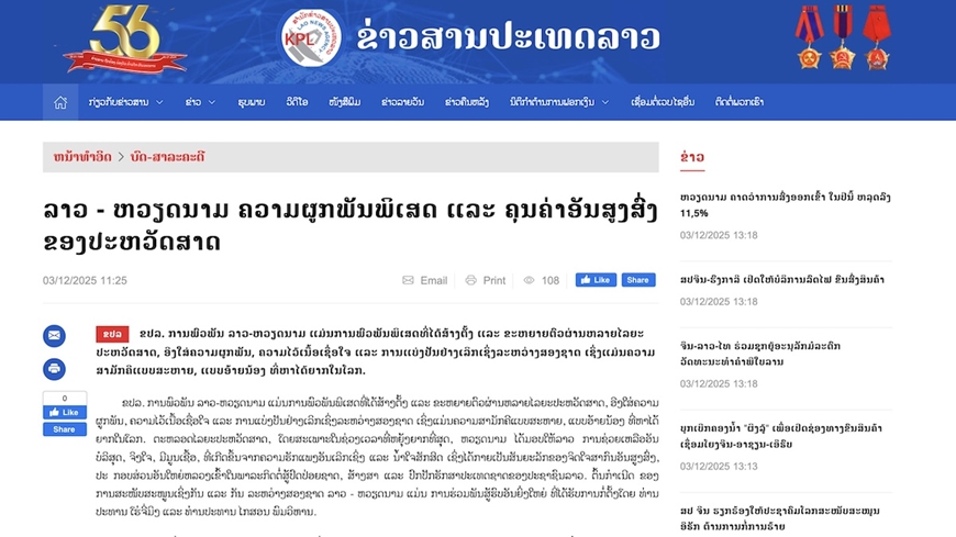 Bài viết ca ngợi mối quan hệ đặc biệt Lào - Việt Nam đăng trên trang Báo Thông tấn xã Lào (KPL).