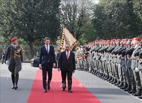 Ngay khi đoàn xe chở Thủ tướng Nguyễn Xuân Phúc dừng tại thảm đỏ, Thủ tướng Áo Sebastian Kurz tới đón, bắt tay Thủ tướng Nguyễn Xuân Phúc tại nơi đỗ xe và trân trọng mời Thủ tướng Nguyễn Xuân Phúc tới chào Đội Danh dự. Ngay sau đó, Quân nhạc cử Quốc thiều hai nước. Dứt tiếng nhạc, hai Thủ tướng cùng sánh bước trên thảm đỏ, duyệt Đội Danh dự và tới chào thành viên Chính phủ và quan chức hai nước.
