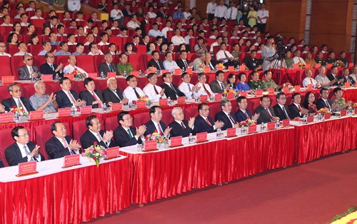 Tổng Bí thư Nguyễn Phú Trọng, Chủ tịch nước Trần Đại Quang cùng các đồng chí lãnh đạo, nguyên lãnh đạo Đảng, Nhà nước và các đại biểu dự Lễ kỷ niệm. Ảnh: TTXVN