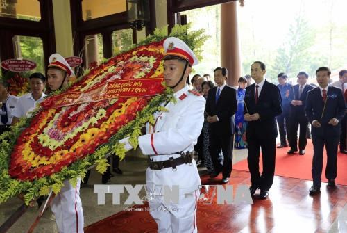 Các đại biểu dâng hương, hoa tưởng niệm Chủ tịch Tôn Đức Thắng. Ảnh: TTXVN. |