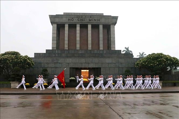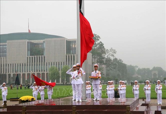 Đội tiêu binh thực hiện hoàn tất nghi thức treo cờ rủ Lễ Quốc tang nguyên Chủ tịch nước, Đại tướng Lê Đức Anh. Ảnh: TTXVN