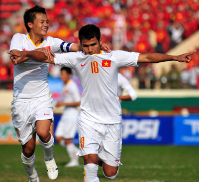 Niềm vui của cầu thủ Thanh Bình và Thành Lương. Ảnh: XUÂN GỤ.