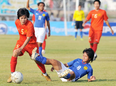 Tiền vệ Mai Lan (số 5) cầm bóng vượt qua sự truy cản quyết liệt của hậu vệ đối phương. Ảnh: TTXVN.