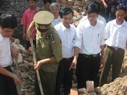 Cán bộ Bộ chỉ huy BĐBP Nam Định và lãnh đạo địa phương trong ngày khởi công xây nhà đại đoàn kết tặng gia đình ông Nguyễn Văn Đông ở xóm 4, xã Giao Hải, huyện Giao Thủy.