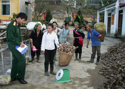 Trời về chiều! Sau một ngày thu hoạch dong riềng cật lực trên rẫy, bà con dân bản ở xã Na Ngoi, huyện Kỳ Sơn (Nghệ An) cõng những gùi dong riềng nặng trĩu về bán cho bộ đội Đoàn KT-QP 4. Việc giao dịch mua bán diễn ra nhanh chóng, vui vẻ. Thượng úy QNCN Võ Quang Định, Đội sản xuất, chế biến dong riềng Đoàn KT-QP 4 - người phụ trách công tác thu mua dong riềng của đơn vị, cho biết: