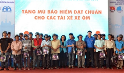 | Ban tổ chức tặng mũ bảo hiểm đạt chuẩn cho các tài xế xe ôm. |
