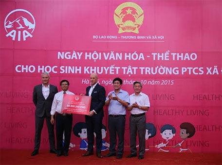 QĐND Online - Ngày 23-10 tại Hà Nội, Công ty Bảo hiểm Nhân thọ AIA Việt Nam phối hợp với Quỹ Bảo trợ trẻ em Việt Nam (BTTE), Quỹ BTTE thành phố Hà Nội tổ chức Ngày hội Văn hóa-Thể thao cho học sinh khuyết tật trường PTCS Xã Đàn nhằm động viên và khích lệ các em học sinh khuyết tật nâng cao thể chất, thêm nghị lực và thêm niềm vui để vươn lên trong cuộc sống. Thông qua chương trình, AIA Việt Nam đã tài trợ 60 triệu đồng cho các hoạt động văn hóa-thể thao của trường.