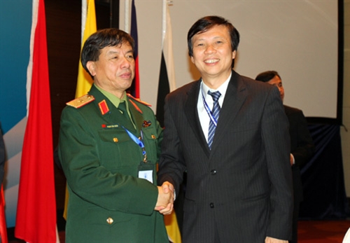 | Thiếu tướng Phạm Văn Huấn, Tổng Biên tập Báo Quân đội nhân dân chúc mừng ông Hồ Quang Lợi, Tổng Thư ký thường trực mới của CAJ |