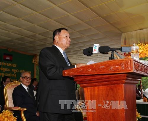 Chủ tịch Thượng viện Cam-pu-chia Samdech Say Chhum phát biểu tại Lễ khánh thành Tượng đài. Ảnh: TTXVN