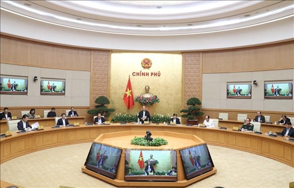 Thủ tướng Chính phủ Nguyễn Xuân Phúc chủ trì cuộc họp của Thường trực Chính phủ về phòng, chống dịch bệnh Covid-19. Ảnh: TTXVN