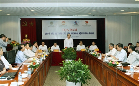 Đồng chí Nguyễn Thiện Nhân, Ủy viên Bộ Chính trị, Chủ tịch Ủy ban Trung ương MTTQ Việt Nam chủ trì buổi tọa đàm góp ý vào Dự thảo các văn kiện Đại hội XII của Đảng. Ảnh: TTXVN