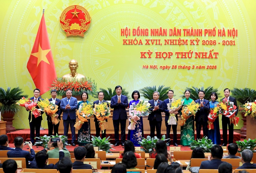 | Thường trực Thành ủy Hà Nội tặng hoa chúc mừng các đồng chí được bầu vào Thường trực Hội đồng nhân dân thành phố khóa XVII, nhiệm kỳ 2026-2031. Ảnh: quochoi.vn |