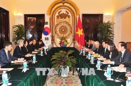 Trong không khí hữu nghị, chân thành, hai bên điểm lại những thành tựu nổi bật trong quan hệ hai nước thời gian qua, nhất là từ khi thiết lập quan hệ Đối tác hợp tác chiến lược năm 2009 đến nay, trao đổi về các biện pháp thúc đẩy sâu rộng hơn nữa quan hệ Đối tác hợp tác chiến lược Việt Nam-Hàn Quốc cũng như về các vấn đề khu vực và quốc tế cùng quan tâm.