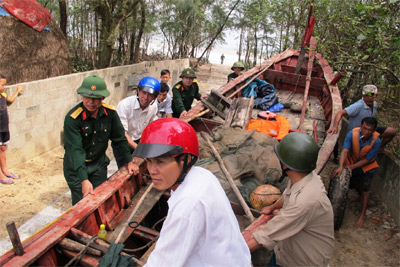 | Bộ đội và nhân dân xã Kỳ Phú, huyện Kỳ Anh chuyển tàu, thuyền vào bờ tránh bão. |