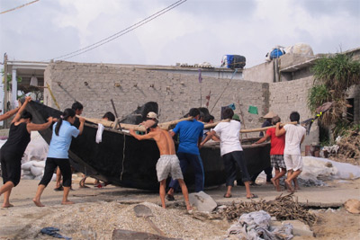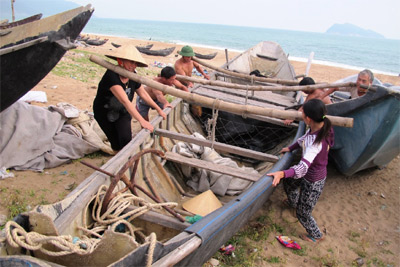 | Ban CHQS huyện Kỳ Anh điều động cán bộ, chiến sĩ đảo Sơn Dương giúp người dân xứ đạo Đông Yên chuyển thuyền vào bờ. |