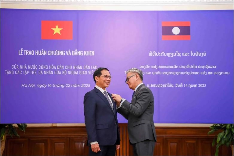 | Bộ trưởng Bộ Ngoại giao Lào Thongsavanh Phomvihane trao Huân chương của Nhà nước Lào tặng Phó thủ tướng Chính phủ, Bộ trưởng Bộ Ngoại giao Bùi Thanh Sơn. Ảnh: BNG |