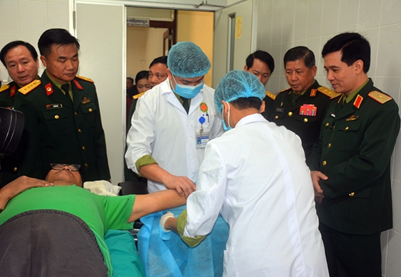 Các bác sĩ đoàn công tác QĐND Việt Nam xử trí vết thương cho bệnh nhân Lào. |