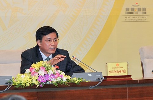 Phát biểu tại buổi họp báo, đồng chí Nguyễn Hạnh Phúc cho biết: Quốc hội khóa XIV đã hoạt động được gần một năm, nhưng nhiều áp lực đặt ra cho Quốc hội phải giải quyết, đó là tiếp tục thể chế Hiến pháp năm 2013 vào cuộc sống bằng việc phải sửa đổi nhiều luật; triển khai Nghị quyết Đại hội Đảng toàn quốc lần thứ XII; bảo đảm tăng trưởng kinh tế bền vững, cải cách bộ máy hành chính, công vụ, phòng, chống tham nhũng lãng phí...; việc xây dựng Nhà nước pháp quyền và phát triển toàn diện đất nước trong thời kỳ mới đứng trước nhiều thời cơ, thuận lợi, nhưng cũng phải đương đầu với những khó khăn, thách thức, đòi hỏi Quốc hội, đại biểu Quốc hội ngày càng phải phát huy vị thế, đổi mới, nâng cao chất lượng hoạt động, xứng đáng là cơ quan quyền lực cao nhất đại diện cho ý chí, nguyện vọng của nhân dân.