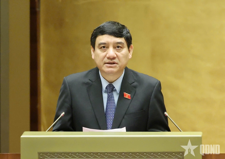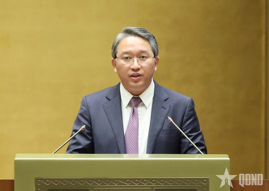 | Bộ trưởng Bộ Tư pháp Nguyễn Hải Ninh trình bày tờ trình của Chính phủ. Ảnh: TRỌNG HẢI |