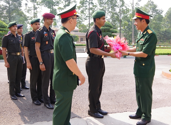 Đại diện Chỉ huy Sư đoàn 9 tặng hoa các sĩ quan trẻ Ấn Độ. |