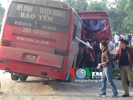 Vụ tai nạn xảy ra giữa một xe buýt chạy tuyến Mỹ Đình - Hà Nội mang BKS: 29B - 09334 cùng một xe khách mang BKS: 24B - 00502. Theo ghi nhận của phóng viên tại hiện trường, thời điểm xảy ra tai nạn cả 2 xe đang di chuyển cùng chiều, do không làm chủ được tốc độ, xe buýt đã đâm vào phía sau xe khách.
