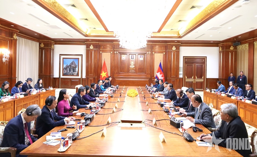 Chủ tịch Hun Sen nhiệt liệt chào mừng và đánh giá cao chuyến thăm chính thức Campuchia của đồng chí Thường trực Ban Bí thư Trần Cẩm Tú và Đoàn Đại biểu cấp cao Việt Nam, khẳng định đây là minh chứng sinh động cho sự phát triển mạnh mẽ, bền chặt và khăng khít của quan hệ Việt Nam - Campuchia.