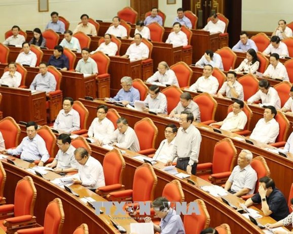 Đồng chí Trần Quốc Vượng, Ủy viên Bộ Chính trị, Thường trực Ban Bí thư điều hành phiên thảo luận về Đề án cải cách chính sách bảo hiểm xã hội. Ảnh: TTXVN. |